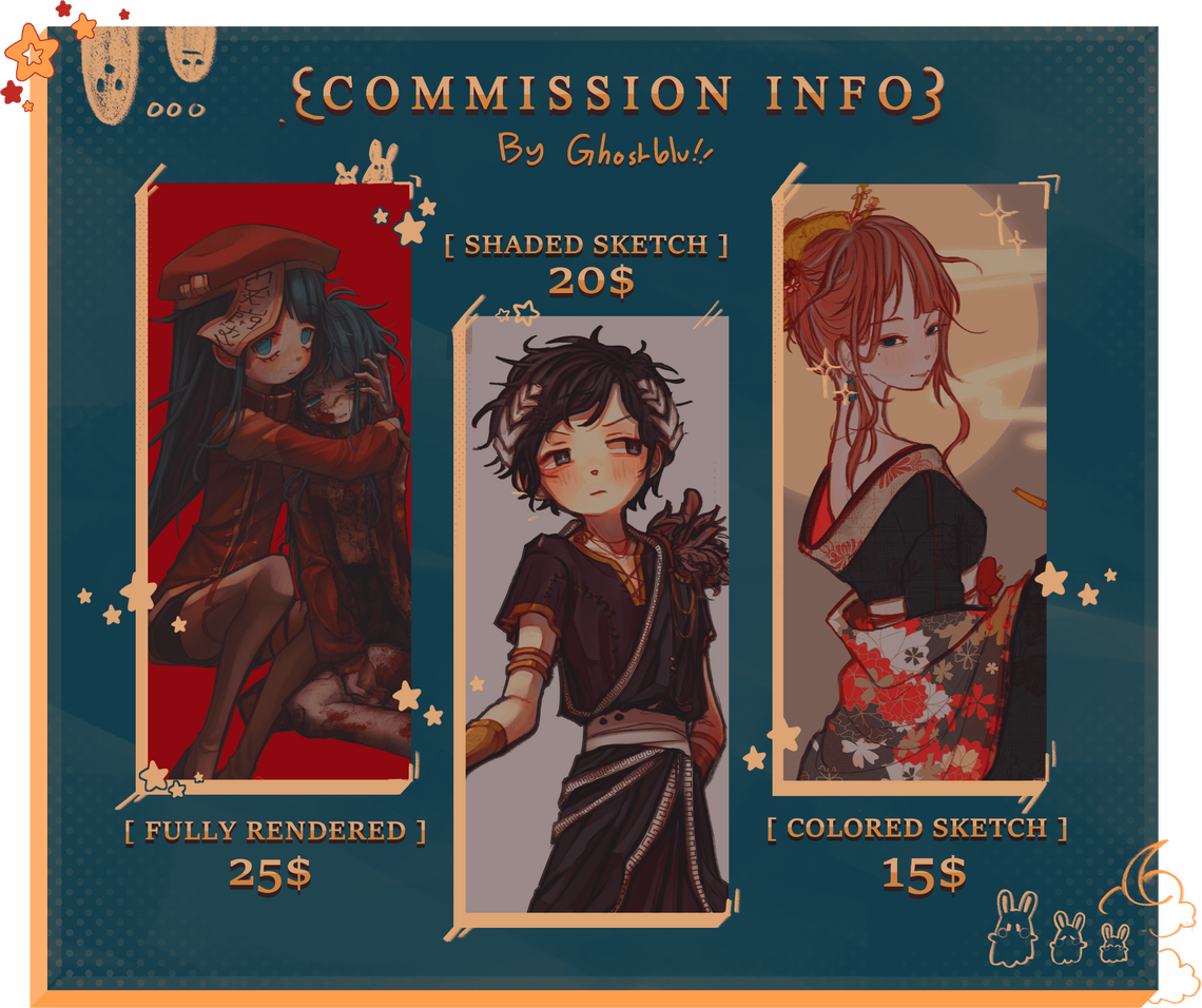- Payment must be made prior before working (50/50 payment method is acceptable!) : PayPal and Kofi only.- These commissions are for PERSONAL use only, clients may repost my work if there's credit present.- I retain the right to use the final product for my own use (* such as portfolio, used as example art, etc.* )- Tweaks can be requested in the final image, but large changes will require additional payment.- I will not do anything NSFW as I am a minor.- Final product will be sent to you via google drive or email.- Refund is not accepted past the sketching phase.- Prices are negotiable :D