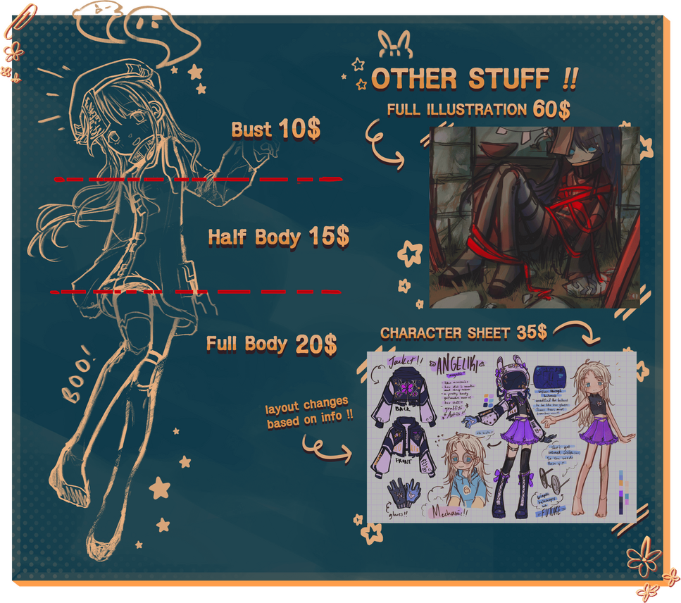 - asking for more than one character will cost an additional 10$ !!- While my set price for full illustrations is 60$, this can however increase depending on how complex an illustration will be.- Character sheet styles can vary !! I create them to match the overall vibe of your character, please know that i will be asking for a lot of info if you request this type of commission :)- I'm hoping to work with you ! !